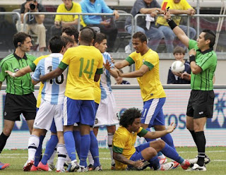 Y que sería un clásico de clásicos sudamericano sin un poco de encontronazos. Desde ataques racistas en 2005 entre Leandro Desábato y Grafite hasta goles anotados con mano por Túlio en 1995, los partidos Brasil-Argentina siempre están plagados de polémicas. Hoy no fue la excepción ya que al minuto 91 Ezequiel Lavezzi y Marcelo se hicieron expulsar luego de una pequeña discusión que llegó a empujones y unas cuantas palabras. A pesar de eso, fue un buen partido ofensivamente y desastroso para ambas defensas que no supieron lidiar con las ofensivas de sus respectivos adversarios.