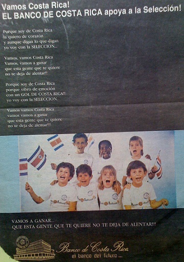 Otro tema que sonaba en las radioemisoras costarricenses durante la eliminatoria del área en 1989 corresponde a la pieza que acompañaba un anuncio publicitario del Banco de Costa Rica (hoy BCR), en el que además en los medios escritos aparecían unos niños apoyando con banderas ticas y con camisetas del desaparecido Banco Infantil. “Porque soy de Costa Rica la quiero de corazón, y aunque digan lo que diganyo voy con la SELECCIÓN…” Llaman la atención las coplas anteriores por cuanto aludían a cierto escepticismo que existía en el país en aquel tiempo con respecto a la suerte que le podría esperar a la Sele.