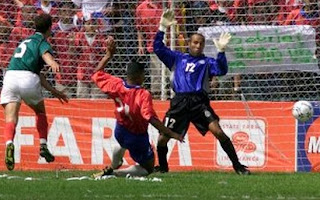 Rónald la BalaGómez no logra cerrar a tiempo y se desaprovecha una valiosa ocasión de gol ante la meta de los mexicanos Manuel Vidrio y Óscar Conejo Pérez. Costa Rica no pudo vencer a México en Tibás y los aztecas consiguieron un valioso punto que prácticamente los salvaría de quedar eliminados del Mundial 2002.