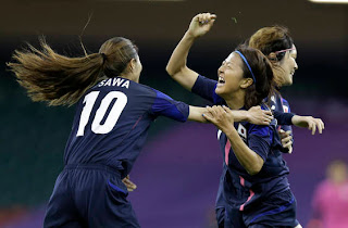 | Sawa (izq.) y Ogimi (der. en frente) celebran el primer gol nipón. |