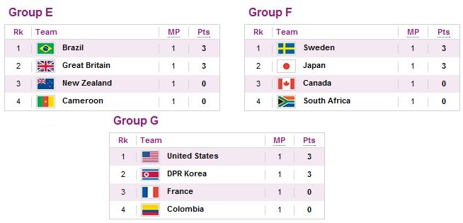 Luego de años de planificación y meses de preparación, la selección británica se enfrentó a Nueva Zelanda en su primer partido oficial en la historia y segundo desde que se convocó la plantilla. El partido que funcionó de apertura deportiva a las Olimpiadas, finalizó 1-0 a favor de las británicas, obteniendo así la primera victoria del evento y de su historia. El gol llegó al minuto 64 luego de un tiro libre exquisitamente ejecutado por la defensa Steph Houghton al palo derecho de la portera neozelandesa Jenny Bindon, luego de una finta de Anita Asante. El partido fue uno de transcurso lento y que fue dominado por las británicas. En el segundo partido del grupo E se enfrentaron unas de las favoritas, Brasil, contra Camerún. Un partido de comienzo rápido Brasil se puso en ventaja con dos fugaces goles en los primeros 10 minutos. El primero fue al minuto 7, en un tiro libre cobrado por Francielle desde el lado izquierdo, que colocó sobre una compañera que se agachó en la barrera, sin oportunidad para la arquera Annette Ngo Ndom ya que lo colocó justo al lado de su poste izquierdo. El segundo gol llegó en el minuto 10, en un tiro de esquina que cobró Francielle al punto penal y que remató de cabeza y al centro de la portería la defensa Renata Costa. Y con ese marcador y un dominio total terminó la primera mitad. En la segunda mitad el transcurso continuó igual, con amplio control de juego de parte de las brasileiras. El tercero llego desde el punto penal al minuto 73 de parte de la capitana Marta. El cuarto gol llego al minuto 79, luego de un cambio de juego desde el mediocampo con Marta, quien luego filtró un pase a Cristiane, que burló la arquera y definió tranquilamente con la portería vacía. El quinto y último, significó el doblete para Marta, cuando Cristiane se proveyó un autopase burlando a tres defensas, para encarar a la portera y asistir a la capitana para la manita y una victoria imponente en la primera fecha para imponer su poderío y domino en esta rama. La próxima jornada en este grupo tendrá a Nueva Zelanda enfrentándose contra Brasil a primera hora y luego a Gran Bretaña contra Camerún a segunda hora, nuevamente en el Millennium Stadium de Cardiff, Gales.