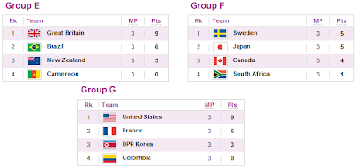 Con todos los partidos finalizados, las selecciones que avanzaron a la próxima fueron: Gran Bretaña, Brasil, Nueva Zelanda (diferencia de gol 0), Suecia, Japón, Canadá (diferencia de gol +2), Estados Unidos y Francia. La distribución de partidos quedó de la siguiente manera: