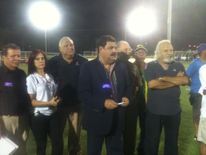 | Eric Labrador (centro) con varios miembros del Comité Ejecutivo durante la inauguración de la LNFPR, dedicada al fenecido delantero puertoriqueño Omar Borralí. Foto: Edwin Jusino. |