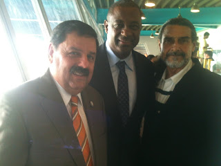 | Eric Labrador, (izquierda) y Jeffrey Webb (centro) en el palco VIP previo al comienzo del partido antes España |