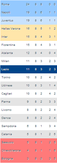 Una sola jugada definió el partido en el que Milán recibía al Udinese. Los rossoneri buscan recuperarse un mal comienzo de temporada en el cual acumulan 2 victorias, 3 empates y 3 derrotas. Un remate de Valter Birsa a pase de Robinho resultó en un golazo inalcanzable para Ivan Kelava. Con ese gol el equipo de Allegri sube de la duodécima posición a la octava, aún muy lejos del líder con 11 puntos de 24 posibles, uno arriba de la Lazio. El otro equipo de Roma visitaba a la Atalanta en Bérgamo de donde salieron con una derrota por 2-1 luego de una actuación muy pobre. Jugadas personales en defensa del arquero Federico Marchetti y del defensa Luis Pedro Cavanda mantuvieron en ceros el marcador hasta que la presión de los locales fue demasiada. Luca Cigarini (41’) abrió el marcador con una volea a más de 20 metros del arco. En la segunda mitad un gol muy luchado del colombiano Brayan Perea a pase de Senad Lulić, emparejó la situación e incluso motivó a los visitantes en ataque. Pero un contraataque del argentino Germán Denis resultó letal, cuando en el uno contra uno frente a Marchetti lo burló con un doble amague para definir con el arco vacío. Esta derrota hunde a los romanos hasta la novena posición y de no recuperar pronto o verse afectadas las aspiraciones en la Europa League podría ponerse en riesgo la posición de Vladimir Petković como DT.