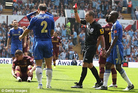 El Chelsea salió al campo con el 11 típico, exceptuando la entrada de Hazard por Florent Malouda, en una planteamiento conservativo como siempre ha sido el Chelsea, con su 4-5-1. El City salió con una estrategia puramente ofensiva con un 3-4-3. Esta estrategia por poco le cuesta caro, cuando al minuto 40, a pesar del constante ataque de los Citizens, Fernando Torres abrió el marcador, punteando el balón sobre Pantilimon a pase filtrado entre dos defensas de Ramires. Pero 2 minutos más tarde, el central Ivanović fue expulsado al cometer una dura entrada sobre Kolarov, a la cual el árbitro no dudo en expulsarlo. En los siguientes 4 minutos dos jugadores del Chelsea, Obi Mikel y Lampard, recibieron amarillas.
