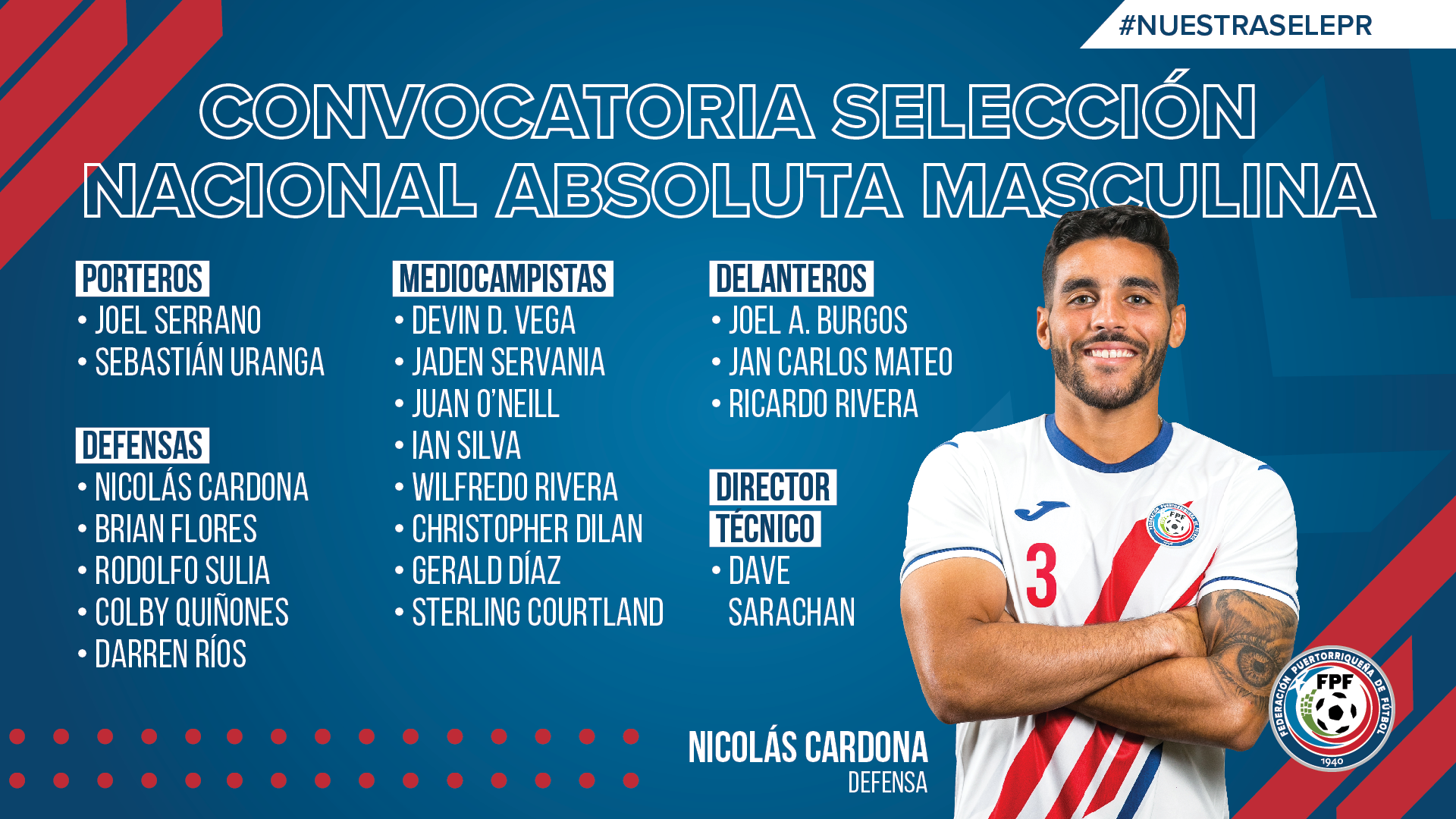 SAN JUAN, Puerto Rico.- El Departamento de Selecciones Nacionales de la Federación Puertorriqueña de Fútbol (FPF) anunció hoy, jueves, a los 18 jugadores que formarán parte del Huracán Azul que se medirá a República Dominicana en Miami la próxima semana.