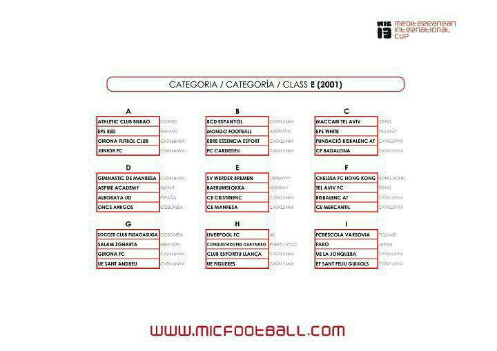 Por su parte, los Conquistadores, que participarán de la categoría Clase del 2001 o U12, están en el grupo H ante el Liverpool FC, CLUB ESPORTIU LLANÇA, y UE Figueres; estos dos últimos son equipos catalanes. En la categoría U12, además del Liverpool FC participan clubes tales como el Athletic Club, RCD Espanyol, Macabbi Tel- Aviv, SV Werder Bremen, entre otros.