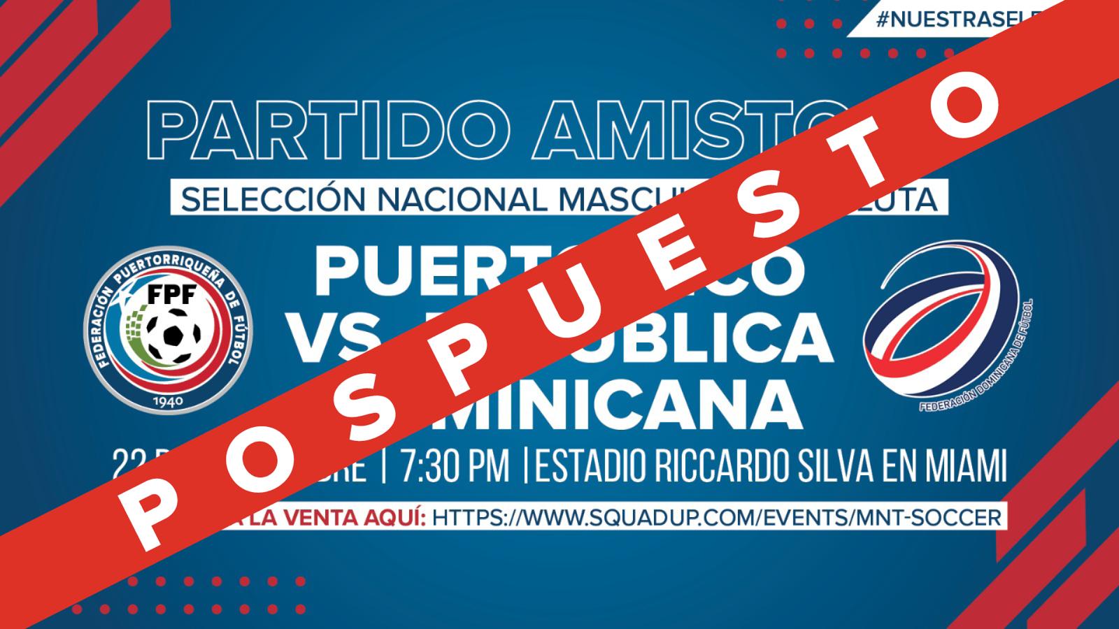 SAN JUAN, Puerto Rico.- La Federación Puertorriqueña de Fútbol (FPF) informó que el partido programado para este jueves, 22 de septiembre de 2022, entre Puerto Rico y República Dominicana en Miami, fue pospuesto tras el paso del huracán Fiona.