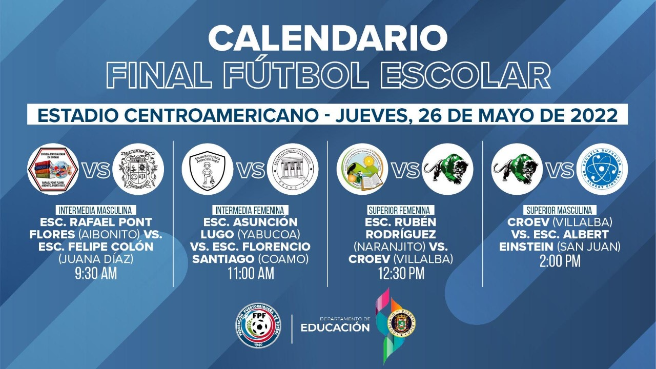 MAYAGÜEZ, Puerto Rico- Los ocho equipos del Departamento de Educación de Puerto Rico (DE) están listos para culminar la temporada del fútbol escolar con los partidos de campeonato este jueves, 26 de mayo de 2022, desde las 9:30 a.m. en el Estadio Centroamericano José Figueroa Freyre de Mayagüez.