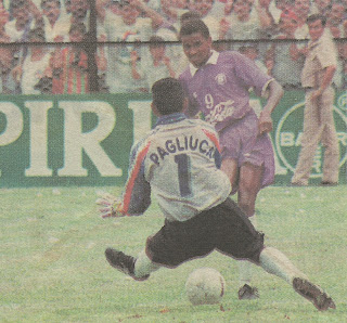 Aquella mañana del domingo 19 de junio resultó muy llamativo el hecho de que el arquero manudo Rojas se presentó al campo del Estadio Alejandro Morera Soto vistiendo justamente la camiseta que había conseguido tras el trueque con Gianluca Pagliuca. Agüizote para algunos, un gran obsequio que ostentar para otros, lo cierto es que al final ni José Alexis ni sus compañeros manudos pudieron rescatar la serie, pues pese a triunfar 2-1 el marcador global les fue insuficiente y sufrieron la celebración saprissista en su propio Gigante de El Llano. El gol de los morados, que a la postre aseguraría el primer título tibaseño tras una sequía de cinco años, fue obra del volante Roy Myers al minuto 47, cuya acción se contempla en la imagen de marras.
